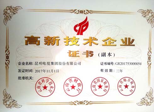 2017年12月,昆明電纜集團股份有限公司再次通過了高新技術(shù)企業(yè)的認定,被云南省科學技術(shù)廳、云南省財政廳、云南省國家稅務(wù)局、云南省地方稅務(wù)局認定為“高新技術(shù)企業(yè)”。